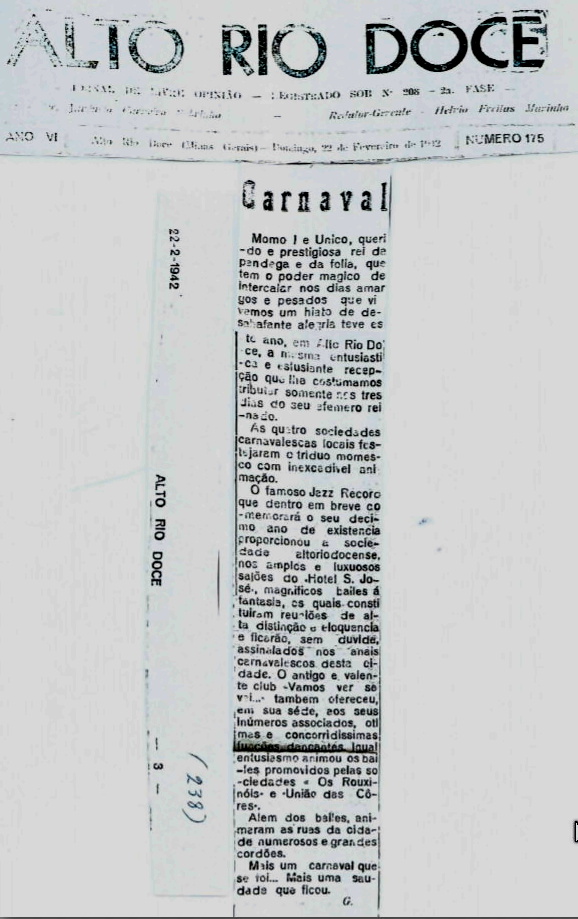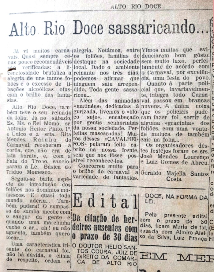 Com relação ao Carnaval de Alto Rio Doce podemos dizer que o povo desta cidade já é carnavalesco desde quando nasce. Por várias décadas tinha os bailes nos clubes e as pessoas saiam pelas ruas formando um cordão, dançando e cantando. Na década de sessenta foi introduzido no carnaval a Burrinha (Uma espécie de Bumba Meu Boi). Atrás desta Burrinha, iam umas pessoas tocando violão, pandeiro, sanfona e cavaquinho. Em 1973 um grupo de pessoas apaixonadas por esta cidade e pelo carnaval, introduziram na Burrinha instrumentos como: surdo, tamborim, tarol e instrumentos de sopro passando a tocar as marchinhas de carnaval como “Mamãe Eu Quero”, “Abrem Alas”, ”Jardineira Por Que Estás Tão Triste” dentre outras e ai nasceu o Bloco da Villa Ambrozina. Hoje o carnaval de Alto Rio Doce é um dos mais animados da região e tem os Blocos do Sapolândia, Villa Ambrozina e outros. Foi aprovado na Câmara Municipal uma lei onde a Prefeitura passou a designar uma verba para a confecção das Burrinhas, antes era feita por particulares. O carnaval começa na sexta com a chuva de confete, no sábado a noite sai o Bloco da Villa Ambrozina com os bonecos do Tigrão, Vaca Louca e outros pelas ruas da cidade. De domingo a terça-feira sai a partir da tarde a Burrinha com os blocos da Villa Ambrozina, Sapolândia e outros arrastando uma multidão pelas ruas da cidade. Também tem o show a parte da “Escola de Samba Unidos do Rio Doce“ que sai a noite com suas alegorias, brilhando ainda mais nosso carnaval. Isto sem falar nos bares que também tem seus shows a parte, vale a pena conferir.